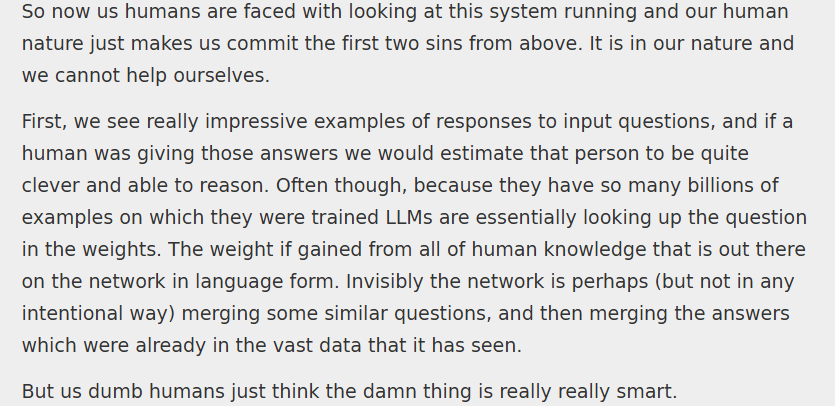 LLMs trick you because your brain automatically assumes that the abstractions triggered in your head by its output must map to abstractions from the entity that generated the words. So triggered, you assume - incorrectly - that the generating entity must be able to reason – to think - using their abstractions just as you can reason on the abstractions evoked in you. The impulse to anthropomorphize the LLM is both mostly imperceptible and almost unstoppable.